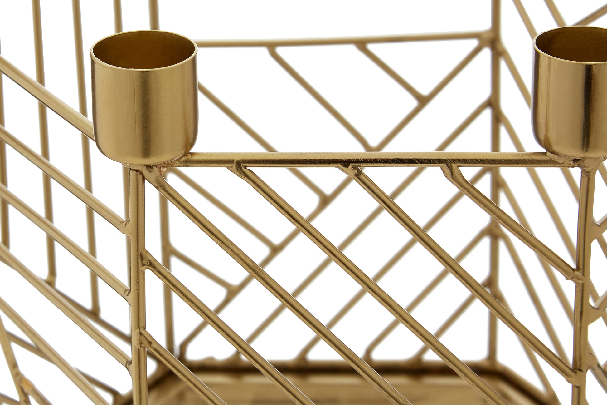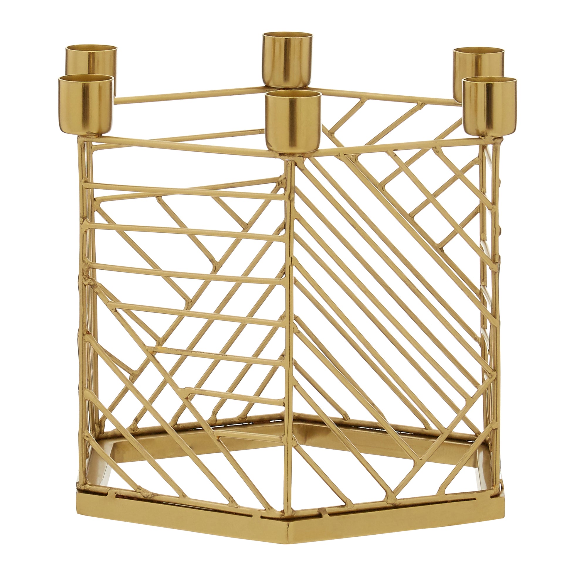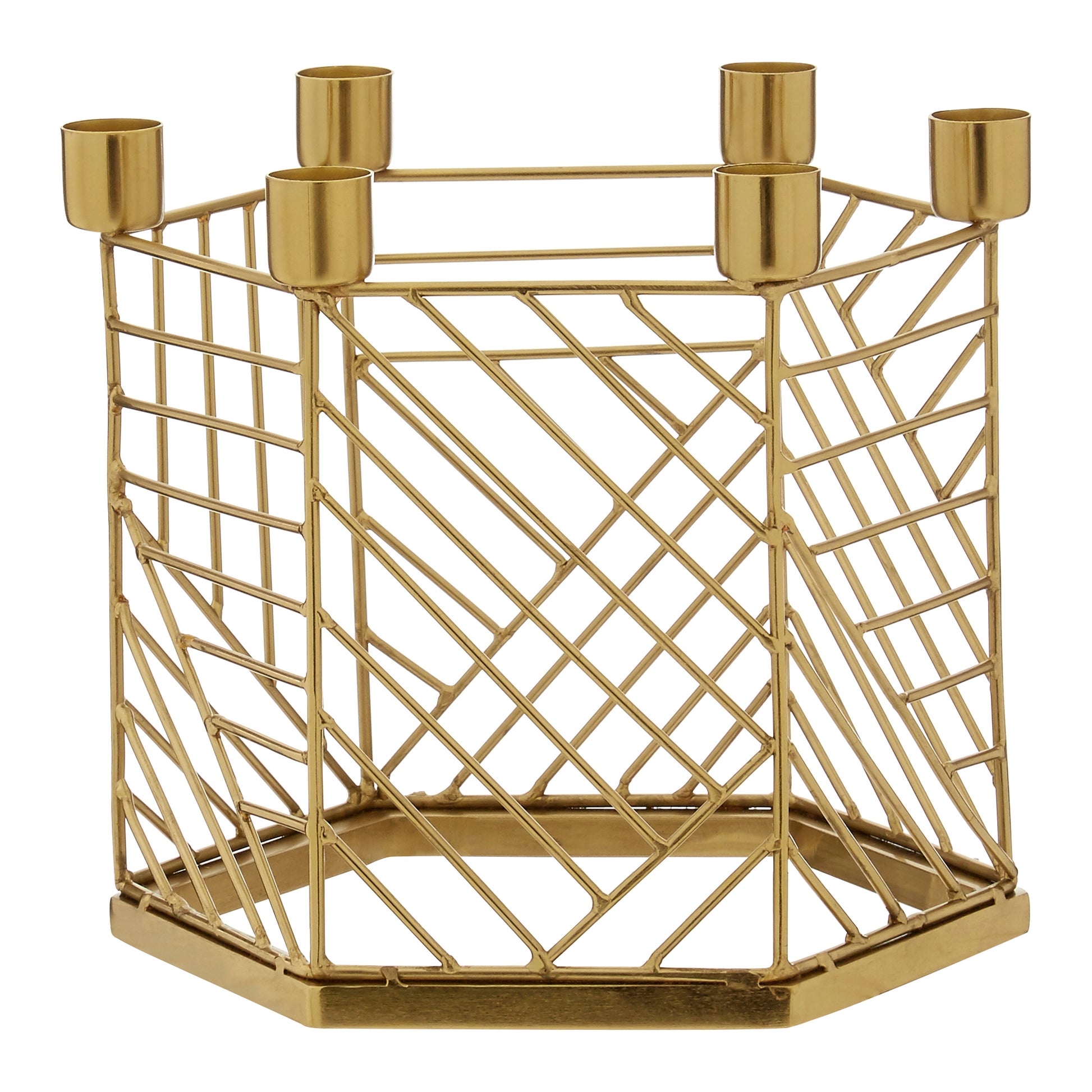 Its hexagonal frame is crafted from metal and has a distinctive linear pattern. The gold finish makes it easy to style in settings with warm toned palettes. Six cups are positioned on the top of the frame, designed to hold a small pillar candle. Use it to introduce a soft, ambient glow to contemporary interiors.